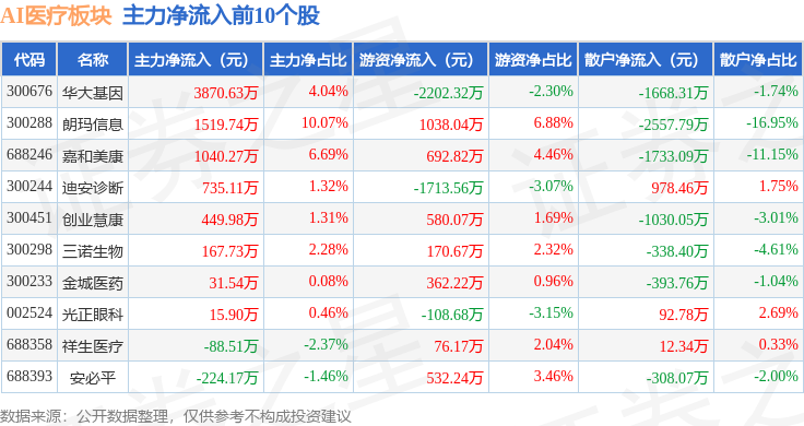 从资金流向上来看,当日AI医疗板块主力资金净流出1.49亿元,游资资金净流入7694.09万元,散户资金净流入7248.14万元。AI医疗板块个股资金流向见下表: