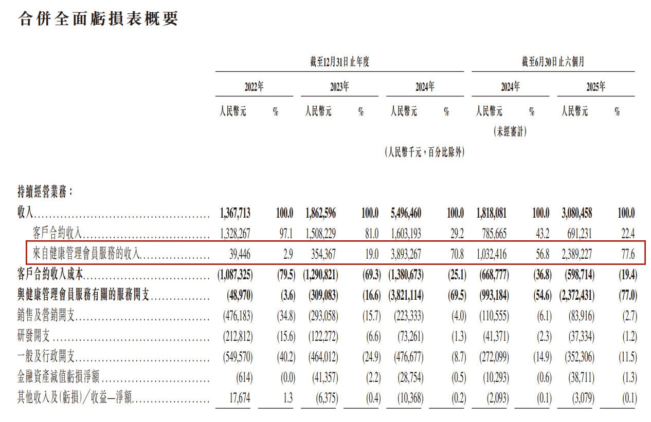 公司营业收入构成较为多元,健康管理会员服务收入占比在2024年及2025年上半年大幅提升,具体数据为: