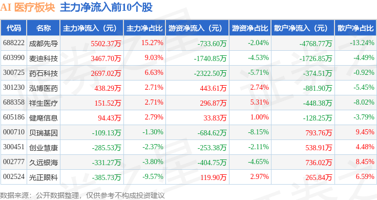 从资金流向上来看,当日AI 医疗板块主力资金净流出1.52亿元,游资资金净流出4111.42万元,散户资金净流入1.93亿元。AI 医疗板块个股资金流向见下表: