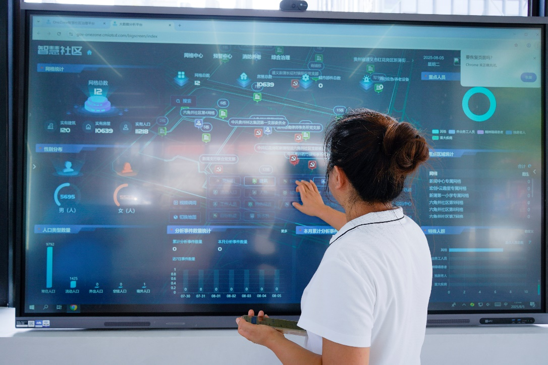 智慧养老平台悉心守护“夕阳红”的安宁,新蒲新区六角井智慧社区则秉持“全龄友好”理念,致力于让每一位居民体验到“住有所安、办有所便”的幸福感。贵州移动锚定“基层减负、数据决策、智能治理”三大方向,搭建起一体化的社区治理综合服务体系。在六角井社区服务中心,智慧管理大屏依托3D地图建模技术,动态呈现辖区5912户、2万余名居民的居住信息、安防布局及事项办理进度,真正实现社区全域事件“一图总览、一屏指挥”。