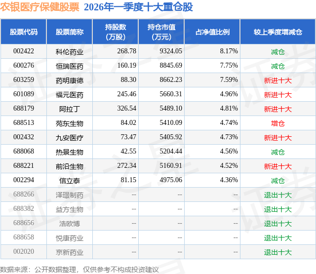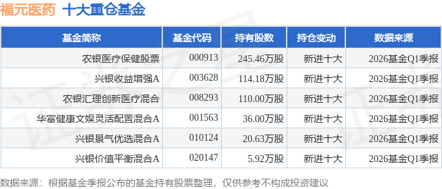 根据2026基金Q1季报公募基金重仓股数据,重仓该股的公募基金共6家,其中持有PG电子官网数量最多的公募基金为农银汇理基金的农银医疗保健股票。农银医疗保健股票目前规模为11.42亿元,最新净值1.5939(4月23日),较上一交易日下跌1.18%,近一年上涨5.39%。该公募基金现任基金经理为梦圆。梦圆在任的基金产品包括:农银汇理创新医疗混合,管理时间为2021年2月24日至今,期间收益率为-48.82%。