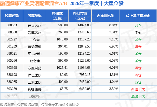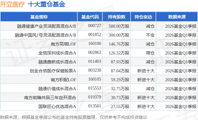 根据2026基金Q1季报公募基金重仓股数据,重仓该股的公募基金共15家,其中持有数量最多的公募基金为融通基金的融通健康产业灵活配置混合A/B。融通健康产业灵活配置混合A/B目前规模为14.07亿元,最新净值2.677(4月28日),较上一交易日上涨0.22%,近一年上涨15.09%。该公募基金现任基金经理为万民远。万民远在任的基金产品包括:融通鑫新成长混合A,管理时间为2021年10月8日至今,期间收益率为35.95%;融通价值成长混合A,管理时间为2022年7月18日至今,期间收益率为31.18%;融通远见价值一年持有期混合A,管理时间为2023年7月18日至今,期间收益率为35.82%。
