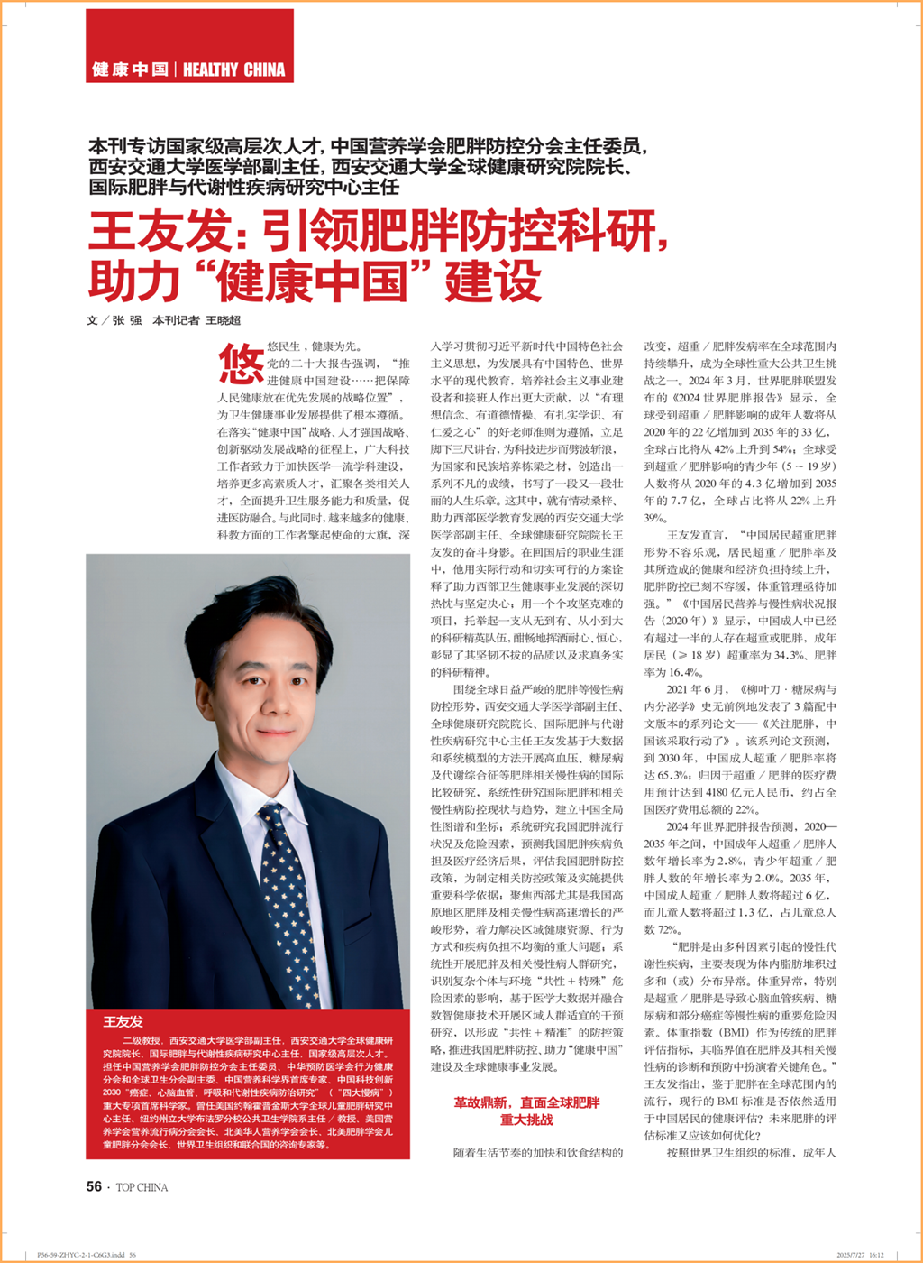 近日,《中华英才》杂志专访西安交通大学医学部副主任、全球PG电子通信健康研究院院长、中国营养学会肥胖防控分会主任委员王友发教授。相关文章以