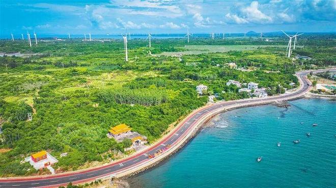 环岛旅游公路儋州火山海岸段,风车与道路相映成趣。海南日报全媒体记者 张茂 摄