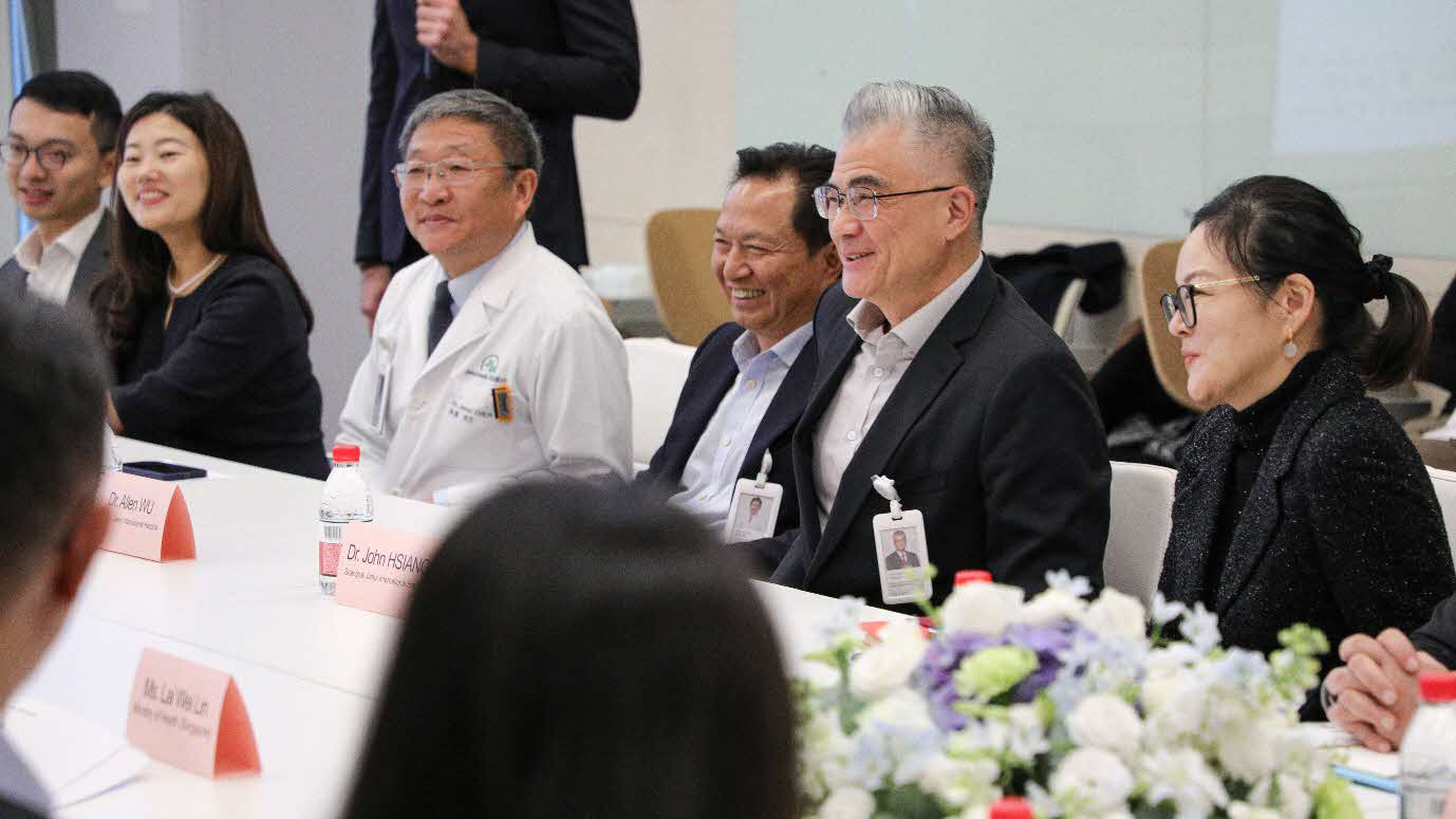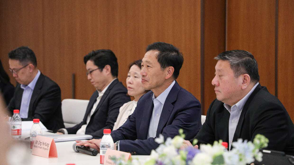 新加坡卫生部兼社会政策统筹部长王乙康(右2),成员包括新加坡驻华大使陈海泉(右1)、新加坡卫生部政策与发展常任秘书赖慧玲(右3)
