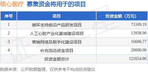证券之星消息,深圳核心医疗科技股份有限公司(简称:核心医疗)拟在上交所科创板上市,募资总金额为12.17亿元,保荐机构为华泰联合证券有限责任公司。募集资金拟用于循环支持前沿产品研发项目、人工心脏产PG电子业化基地建设项目、营销网络及数字化建设项目、补充流动资金项目,详见下表: